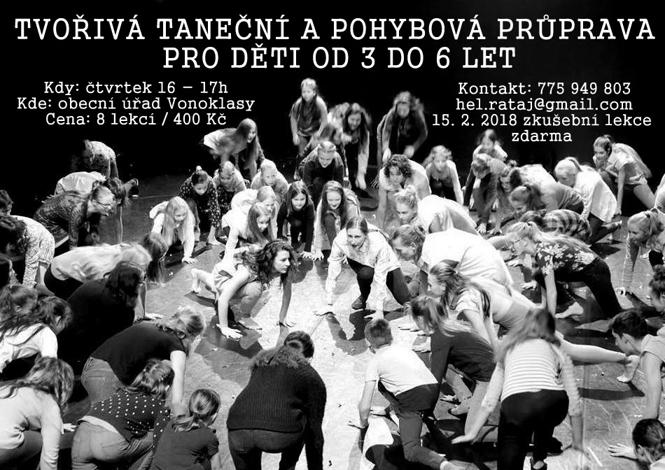 Oznamujeme, že se v budově obecního úřadu v prostorách Vonoklásku bude pravidelně každý čtvrtek konat kroužek tvořivé taneční a pohybové průpravy pro děti od 3 do 6 let.
