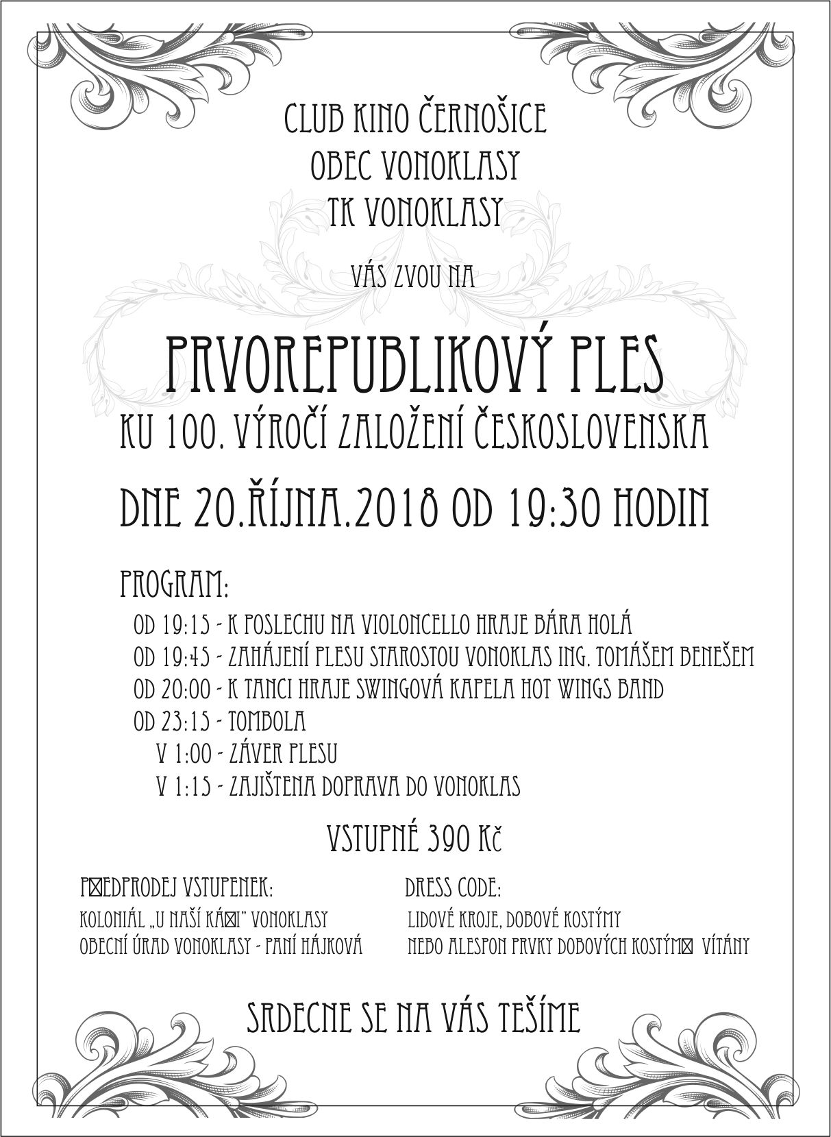 Tenisový klub Vonoklasy a Obec Vonoklasy ve spolupráci s Club Kinem Černošice Vás zvou na Prvorepublikový ples ke 100. výročí založení Československa, který se koná v sobotu 20. října 2018 od 19:30 v Club Kinu Černošice. K tanci i poslechu zahraje swingová kapela Hot Wings Band. Večer bude doplněn tombolou. Noční kyvadlová doprava do Vonoklas zajištěna.